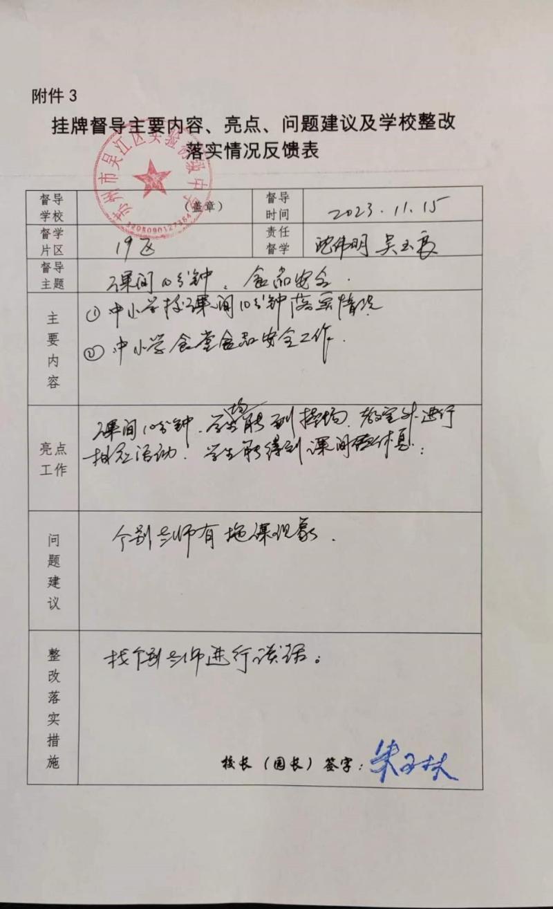 2023年11月15日,根据上级教育督导安排,结合11月份全区教育工作重点,教育局挂牌督导员沈伟明、吴玉良来我校进行督导工作。本次挂牌督导工作内容如下: